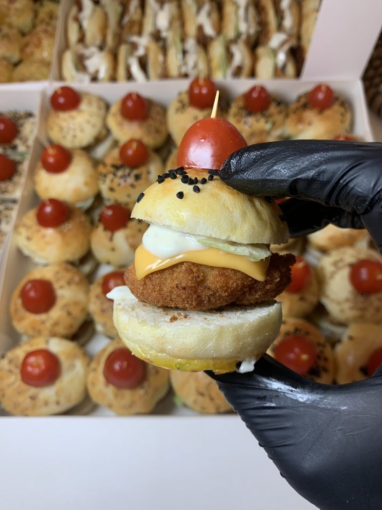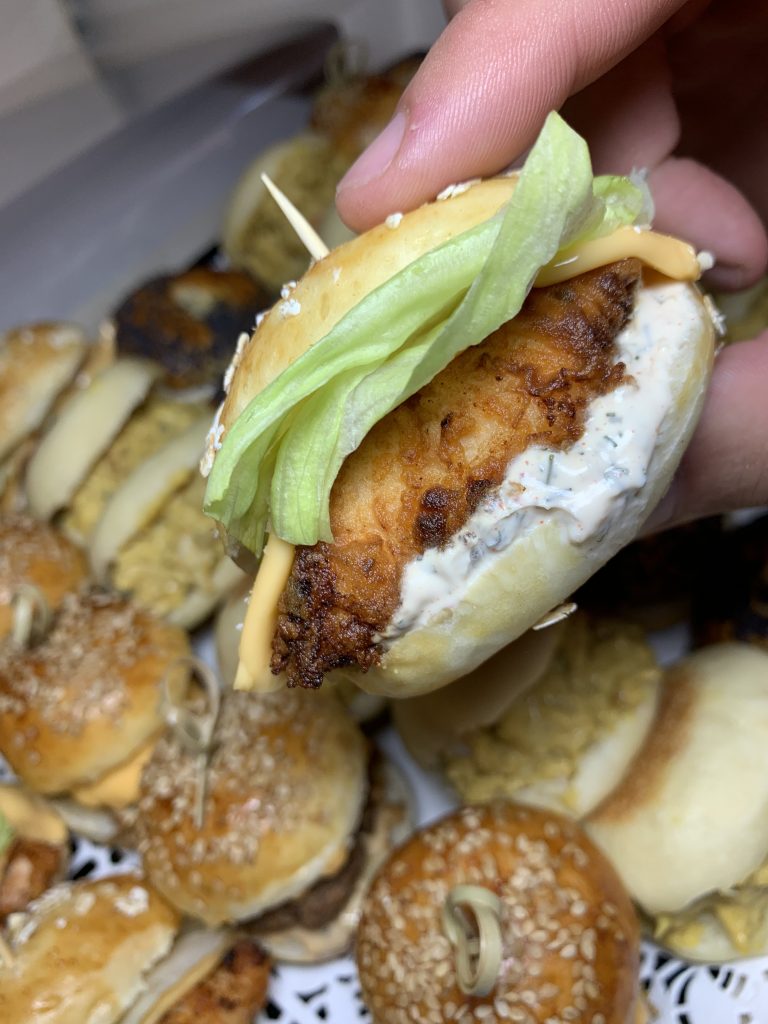 Pain burger, Poulet Pané, Cheddar, Sauce Pita, Oignon Frits, Salade