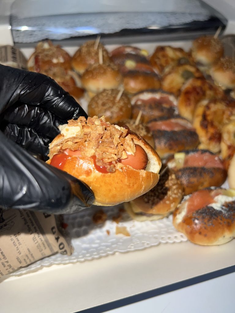 Pain navette, Saucisse, Ketchup, mayonnaise blanche, Oignon Frits